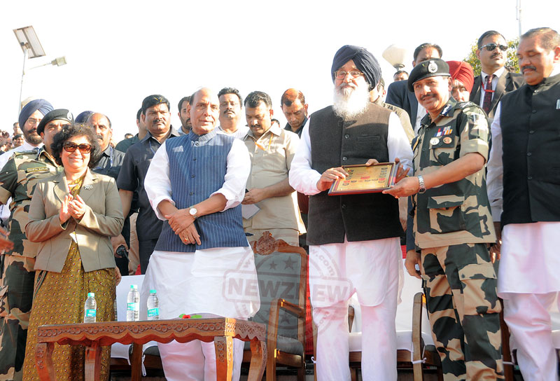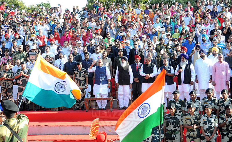 Speaking on the specially organized function to mark the golden jubilee celebrations of Border Secutiry Force (BSF) here at Joint Check Post after laying the foundation stone of viewers’ gallery at a cost of Rs. 24 crore. Mr. Raj Nath Singh assured the Chief Minister that he would soon convene a special meeting of the top brass of his ministry to sort out all the pending issue related to the border areas of the state, particularly the issue of giving compensation to the farmers doing cultivation across the border fence. The Union Home Minister lauded the superb contribution of BSF in safe guarding our borders from external aggression as well as internal disturbances and termed BSF as the ‘frontline of the nation’s deffence ’. Mr. Raj Nath Singh categorically said that our neighboring country Pakistan would never succeed in its nefarious designs to destabilize our country. He said our peace loving people wanted a friendly neighbor adding he mentioned the paramount significance of neighborly relations and bonhomie “saying one can change friends but can’t neighbors”.